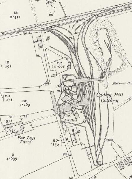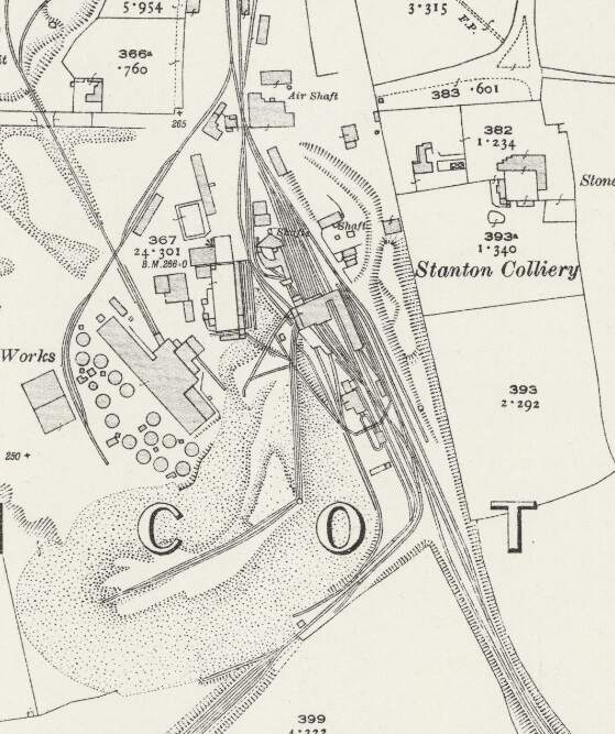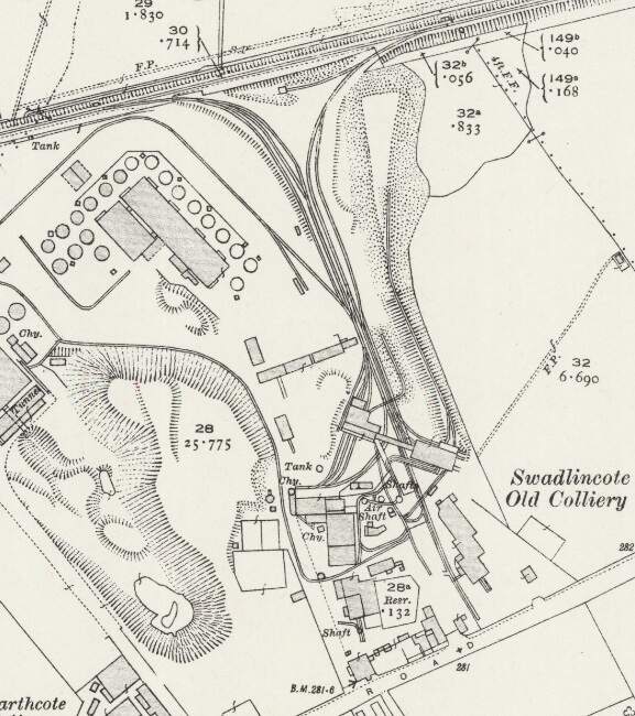 West of Swadlincote, the Swadlincote and Woodville branch served a number of industrial concerns, those closest to Swadlincote included: Swadlincote Old Colliery (and associated Brick & Pipe Works); Stanton Colliery (and Hawfields Brickworks); and Cadley Hill Colliery.
