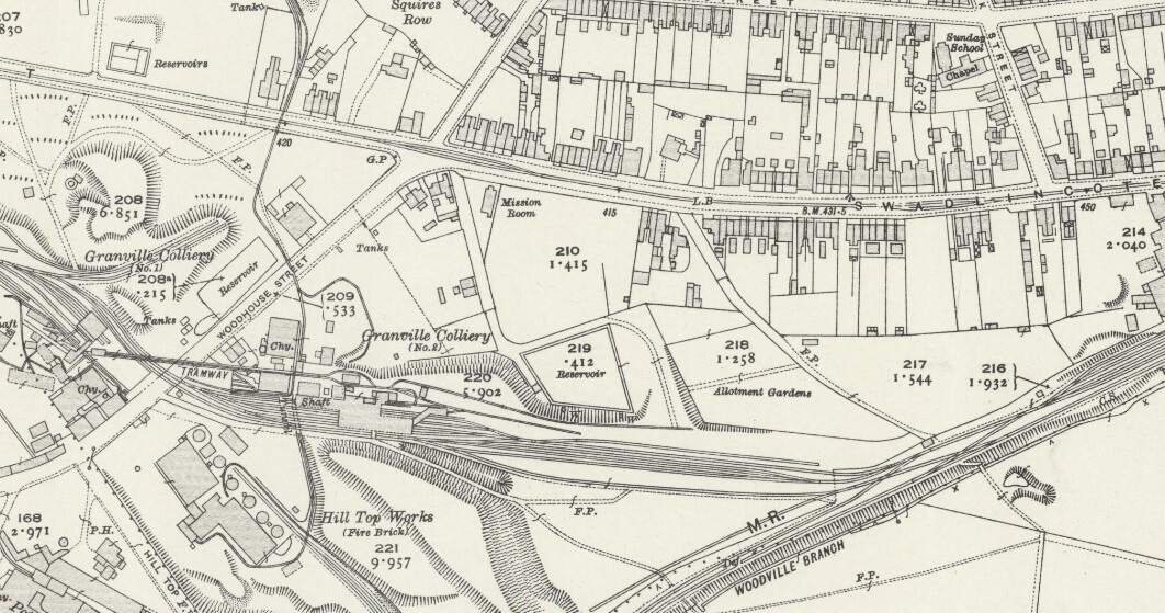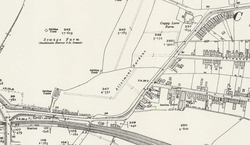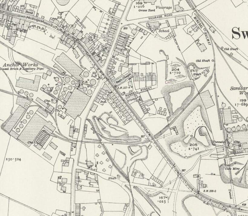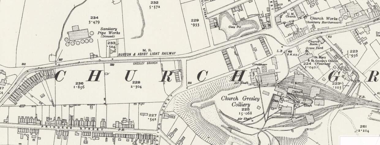 To the East of the overbridge a Mineral Railway left the Swadlincote & Woodville Branch in a southerly direction, it served a number of industrial concerns including: Anchor Glazed Brick and Sanitary Pipe Works (which sat to the Southwest of Swadlincote High Street and which were served by means of a bridge under High Street); Swadlincote Sanitary Pipe Works (on the East side of the High Street/Hill Street); Jack i th’ Holes Pottery (by means of a tunnel under Hill Street and Granville Colliery); Middle Sinks & Chimney Pots Works; and Hill Top Works (by means of a tunnel under Granville Colliery.