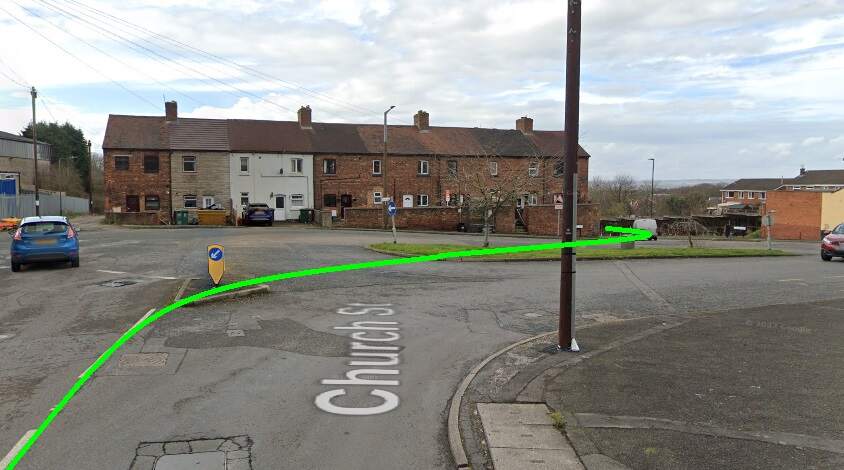The line continued in a generally westerly direction passing Church Sanitary Earthenware Works and Church Gresley Colliery. Sharp right and left curves took the railway through the square at the colliery gates and onto Castle Street. [22]The light Railway served the square outside Castle Gresley Colliery which is now a roundabout. It turned sharply towards the North and then back to wards the West as it left the square. [Google Streetview, March 2023]