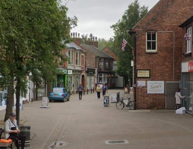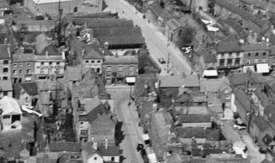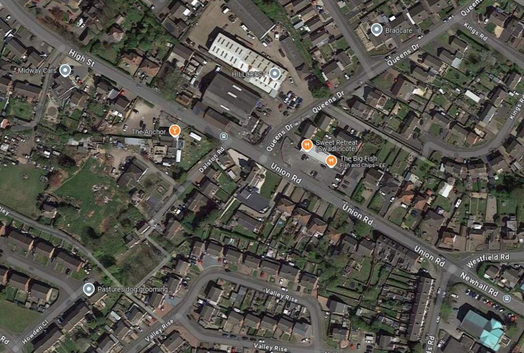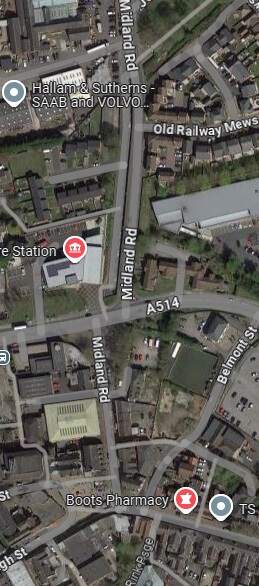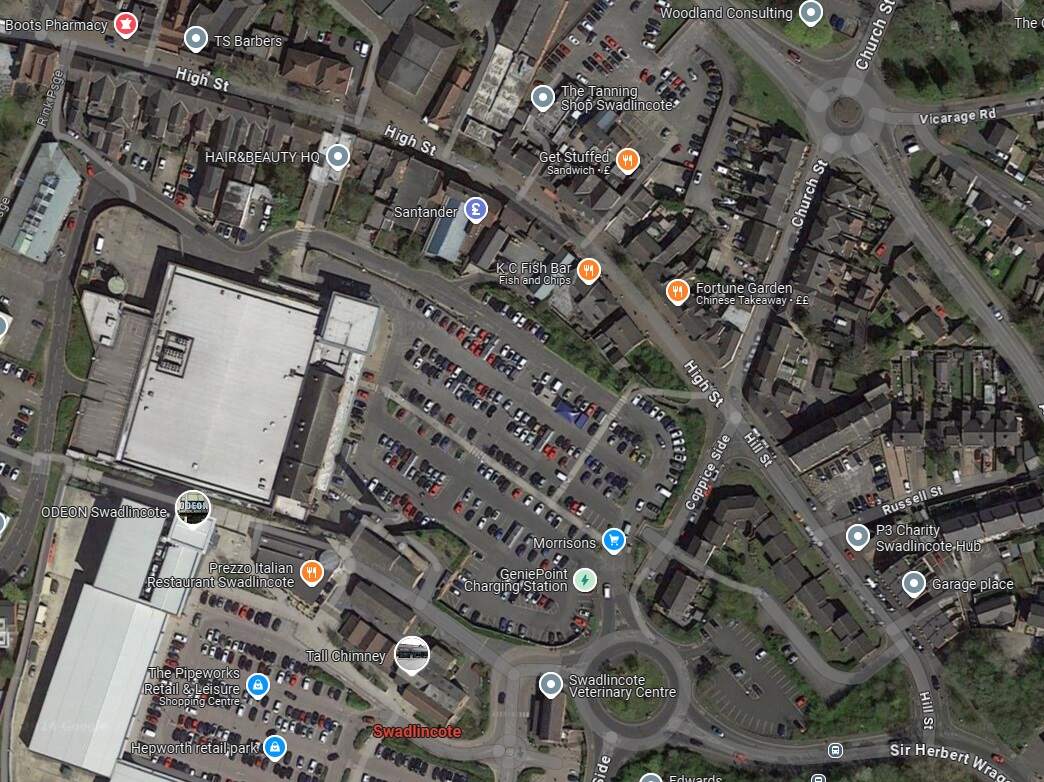 The tram depot off Midland Road, Swadlincote, seen from the West. The trams on the depot are (left to right) Nos. 18, 5, 14, 9 and 10. On the left of the depot is the horse-drawn trolley tower. The map extract immediately below shows the depot (top-left). [3]Glendenning provided a photograph of the bridge in this photograph under construction (see above). The bridge appears on the map extract immediately above and is seen here in use by the Burton and Ashby Light Tramway, (c) Public Domain. [13]A similar view in the 21st century. [Google Streetview, August 2022]The tram depot sat to the East of the Burton and Ashby Light Railway and on the North side of the Swadlincote and Woodville Branch of the Midland Railway, just off the top-right of this extract from the 1920 25″ Ordnance Survey. As can be seen here, the branch into the tram depot left the mainline at high level adjacent to the North abutment of the bridge over the standard-gauge line. The Burton and Ashby Light Railway is shown heading South towards Swadlincote Market Place along Midland Road. Sitting to the West of the Light Railway Bridge and at a lower level was Swadlincote Railway Station. To its North were some Sanitary Earthenware Works. [5]This extract from the 21st century Google Maps satellite imagery shows much the same area as the map extract above. The light railway ran down the full length of Midland Road as far as its junction with the High Street in Sawdlincote. [Google Maps, October 2024]A tram sits on the South side of Market Place and is about to set off for Burton (turning left and running beyond the Town Hall which is at the left rear of the photograph), or Ashby (bearing to the right off the right side of the photograph), (c) Public Domain. [14]A very similar view looking from West Street East into Market Place in the 21st century. [Google Streetview, May 2017]