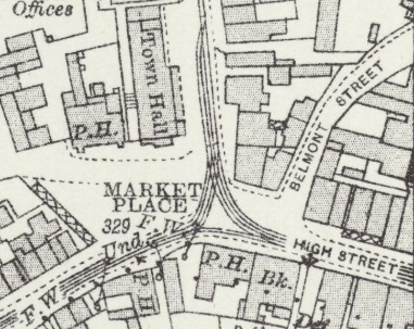 The road East of Swadlincote Market Place is High Street. As can be seen from the closely cropped extract from the 1920 25″ Ordnance Survey, the line was dual-tracked in the vicinity of the Market Place. Midland Road runs down to the Market Place on the East side of the Town Hall. Trams for Ashby left to the bottom-right of the map extract. [5]