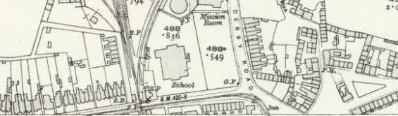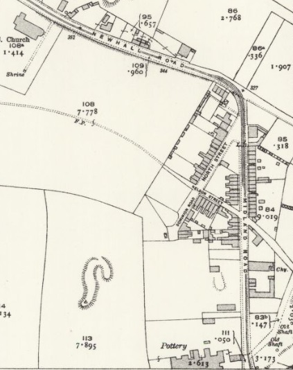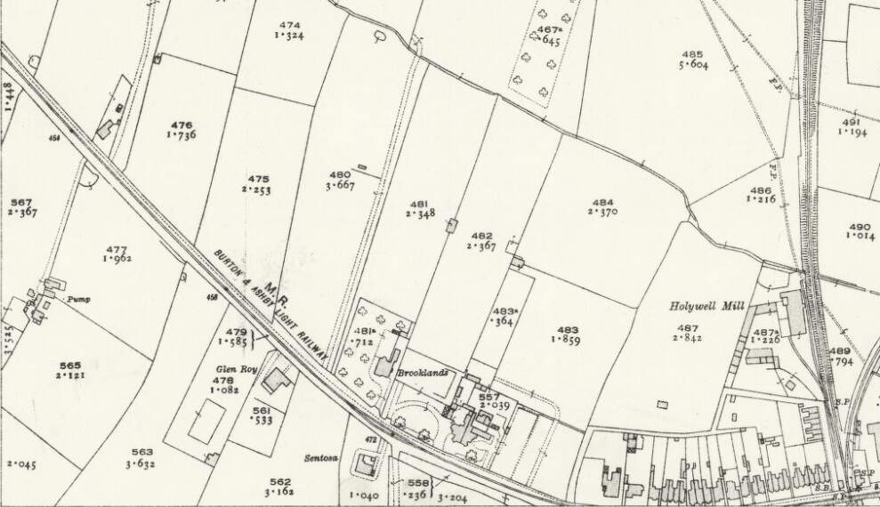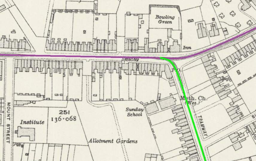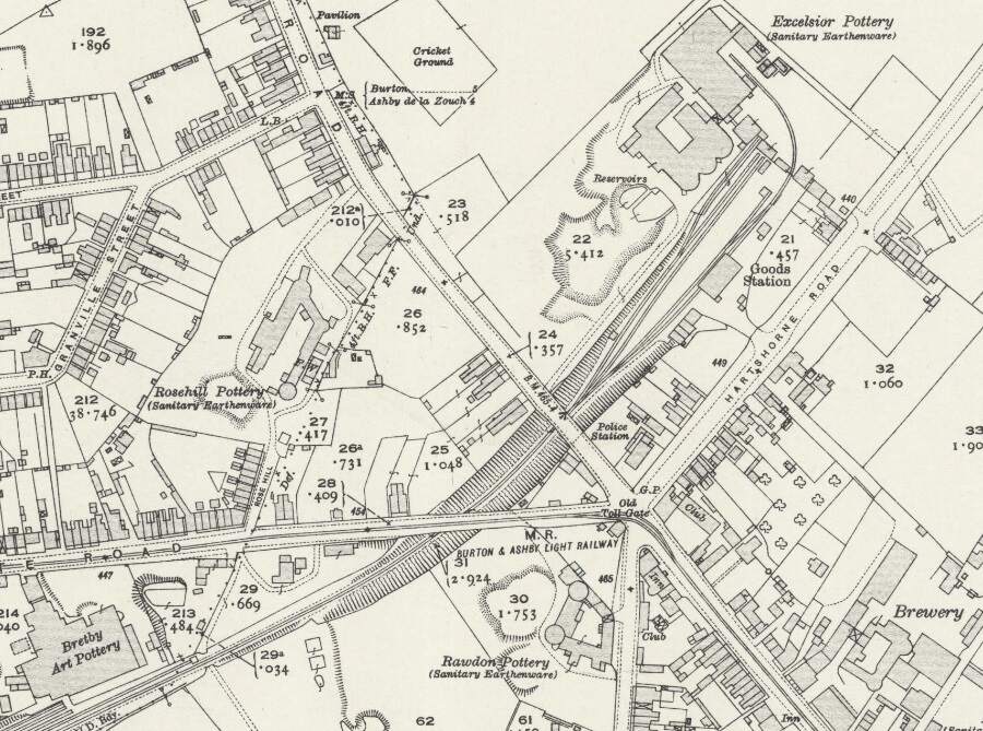 Another extract from the 1920 25″ Ordnance Survey. Trams from Burton-on Trent remained on Newhall Road for only a short distance, turning South along Midland Road. [16]