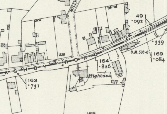On its way down to Ashby-de-la-Zouch the road and light railway traverse another full 1921 25″ OS Sheet with little worthy of note. [21] The next image shows the line as it appears on the 25″ Ordnance Survey, much closer to Ashby-de-la-Zouch. [22]