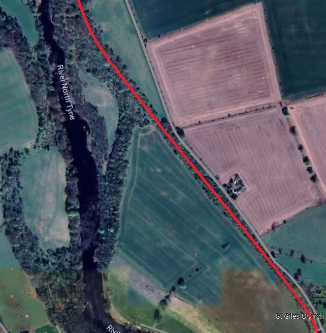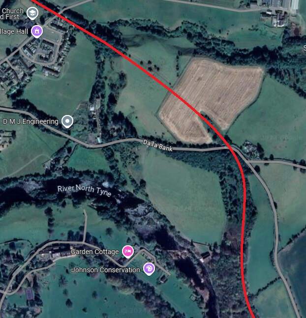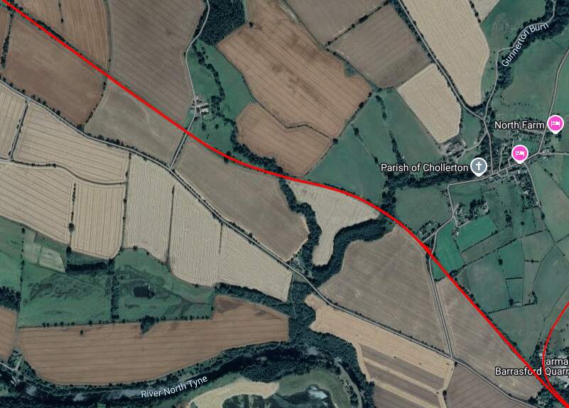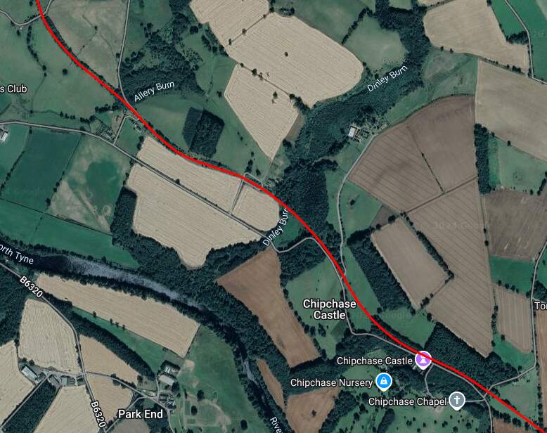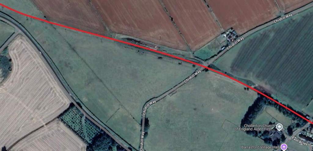 The red line shows the route of the old railway immdiately to the North of Chollerton Railway Station. [Google Maps, October 2024]The cutting South of Dalla Bank, Facing towards Chollerton in 2013, (c) Mike Quinn and licensed for reuse under a Creative Commons Licence (CC BY-SA 2.0). [15]The line continued on as marked by the red line under Dalla Bank and on to Barrasford Station which was located at the top left of this extract from Google’s satellite imagery. [Google Maps, October 2024]The view along the old railway line North-northwest from Dalla Bank. [Google Streetview, August 2023]Barrasford Railway Station name-board. [2]