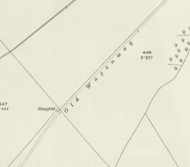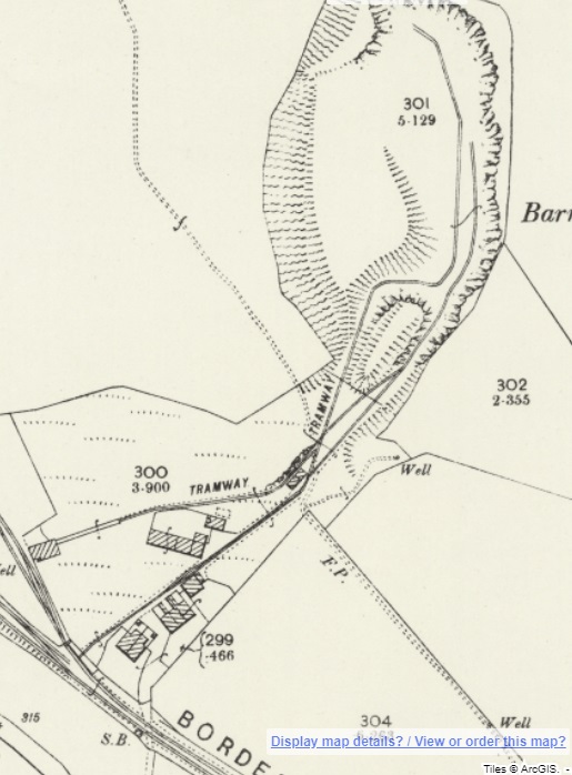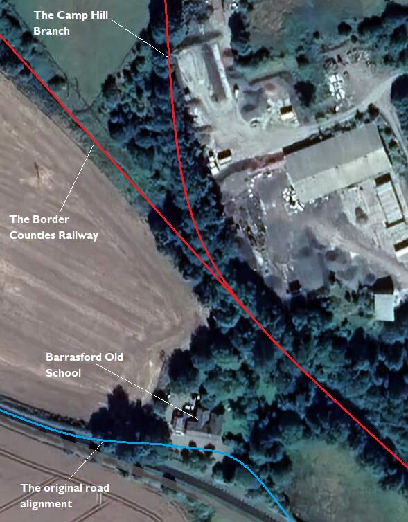 The Camp Hill Branch as shown on satellite imagery from Railmaponline.com. The branch was a short industrial line serving a relatively small quarry to the North of Barrasford Quarry. It appears to have been disused by 1920 as one of the local OS Map sheets across which the line travels shows the line lifted by that time and referred to as an ‘Old Waggonway”. The line is present on map sheets surveyed in 1895.