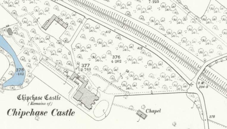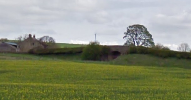 Further to the Northwest, the line as shown on the railmaponline.com satellite imagery. {17}The line ran on to the Northwest and this is the next significant point on the old railway. Close to Chipchase Castle the line was bridged by a minor road. [20]The view across the old railway bridge from the Northeast. [Google Streetview, June 2009]This next roadoverbridge carries an access road over the Border Counties Railway close to Kiln Plantation shortly before the highway turns away from the railway to the West along the North side of the plantation. [21]The view from the South of the road bridge in the map extract above. [Google Streetview, April 2011]The same structure in a photograph taken by Paul Hill and shared by him on the Border Counties Railway Facebook Group on 17th August 2020. [23]
