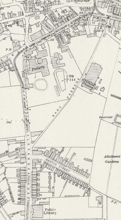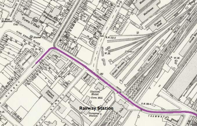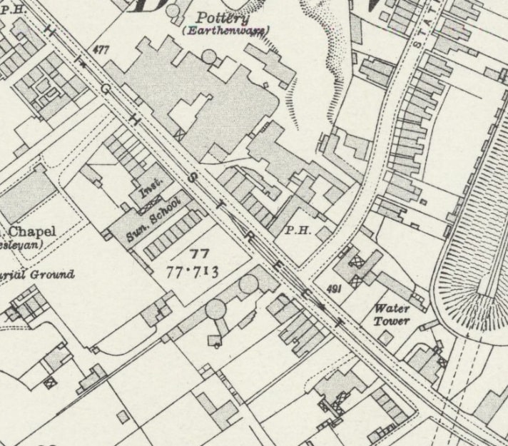 Trams ran East along High Street and turned Southeast and the road became Hill Street. The area to the East of the town centre was heavily industrialised. Different industrial concerns were linked by a network of tramways which were generally below the level of the public road and passed under it, as necessary, by means of bridges and tunnels as the map extract below illustrates.