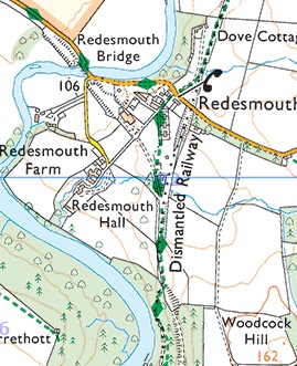 Redesmouth as shown on the OS Explorer Map Sheet. The dismantled railways can easily be seen. The Border Counties Railway bears Northwest from the Station and crosses the River North Tyne.