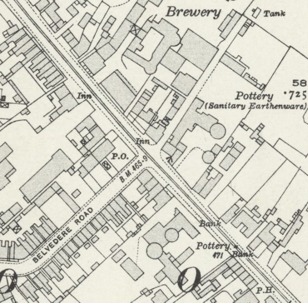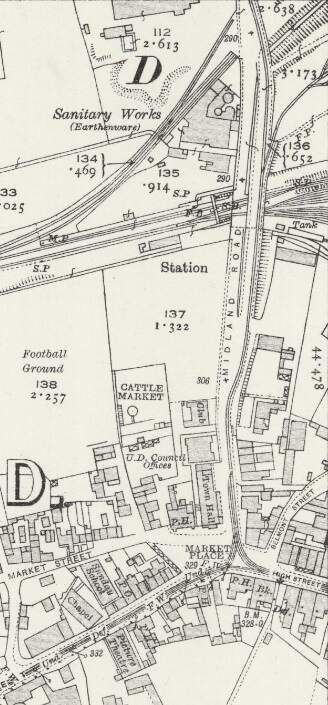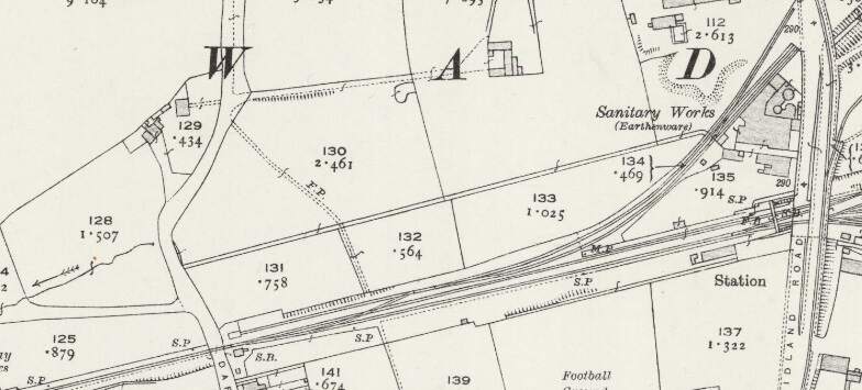 This next extract from the 1920 25″ Ordnance Survey shows the Burton and Ashby Light Railway heading South towards Swadlincote Market Place along Midland Road. Sitting to the West of the Light Railway Bridge and at a lower level was Swadlincote Railway Station. To its North were some Sanitary Earthenware Works. [20]