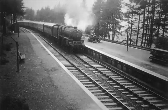 The SR was represented by No 449, Sir Torre, at the head of the train of modern coaches.