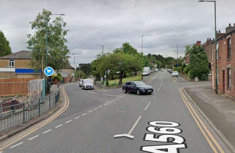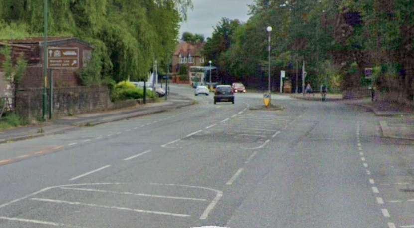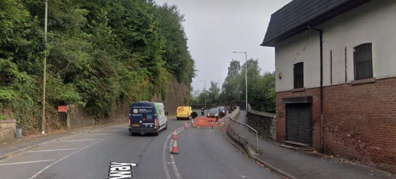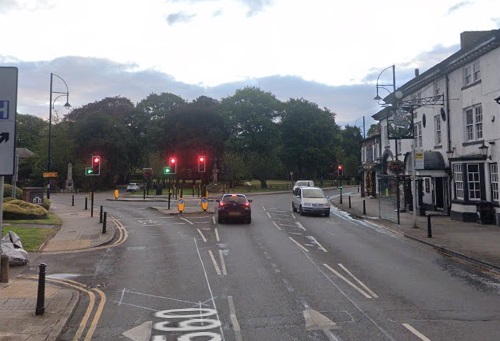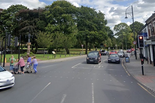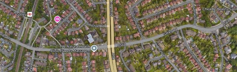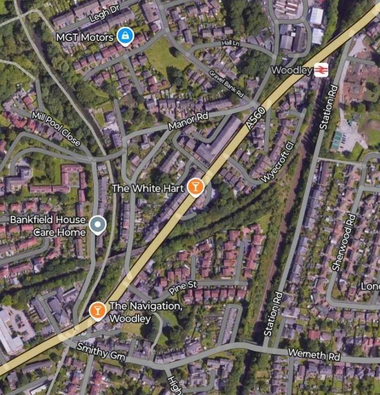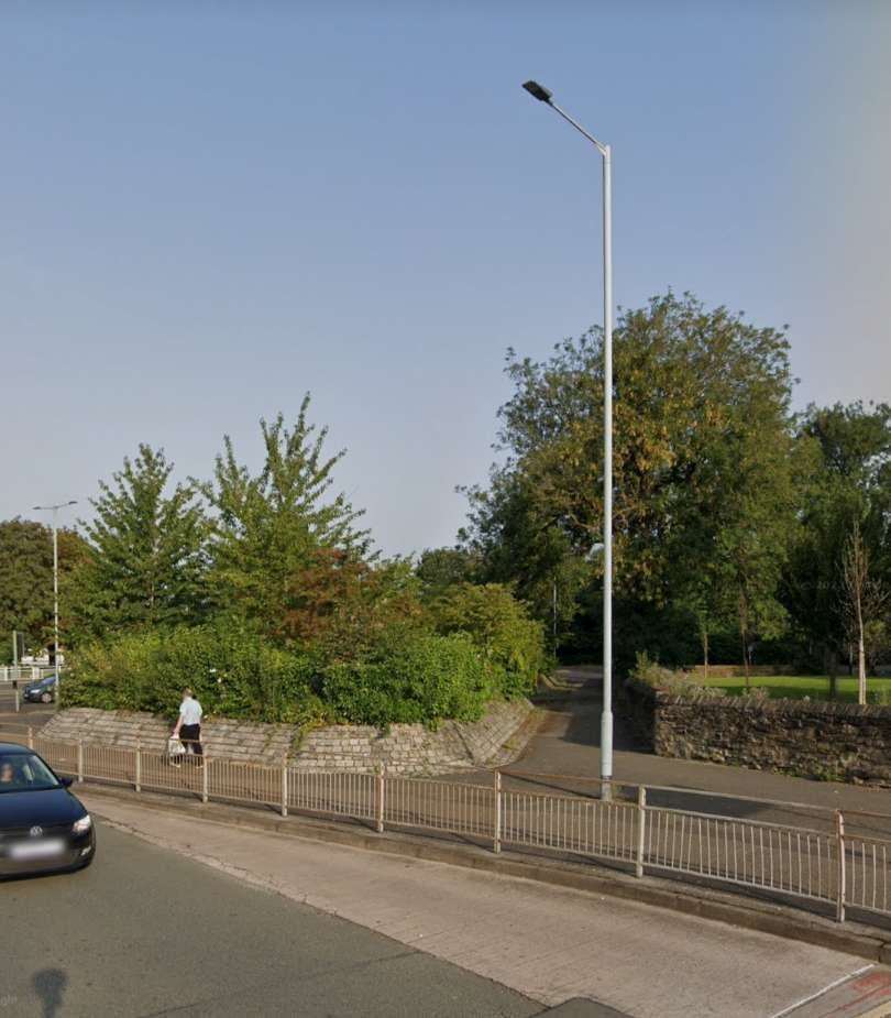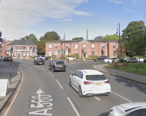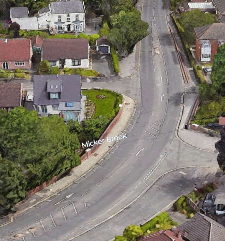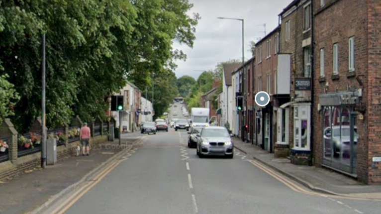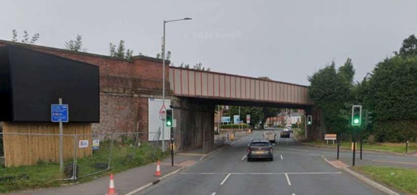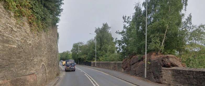 Looking South along the A483. There is nothing to see, at road level, of the bridge over the old railway. The line ran on the near side of the terrace visible on the right. [Google Streetview, July 2024]