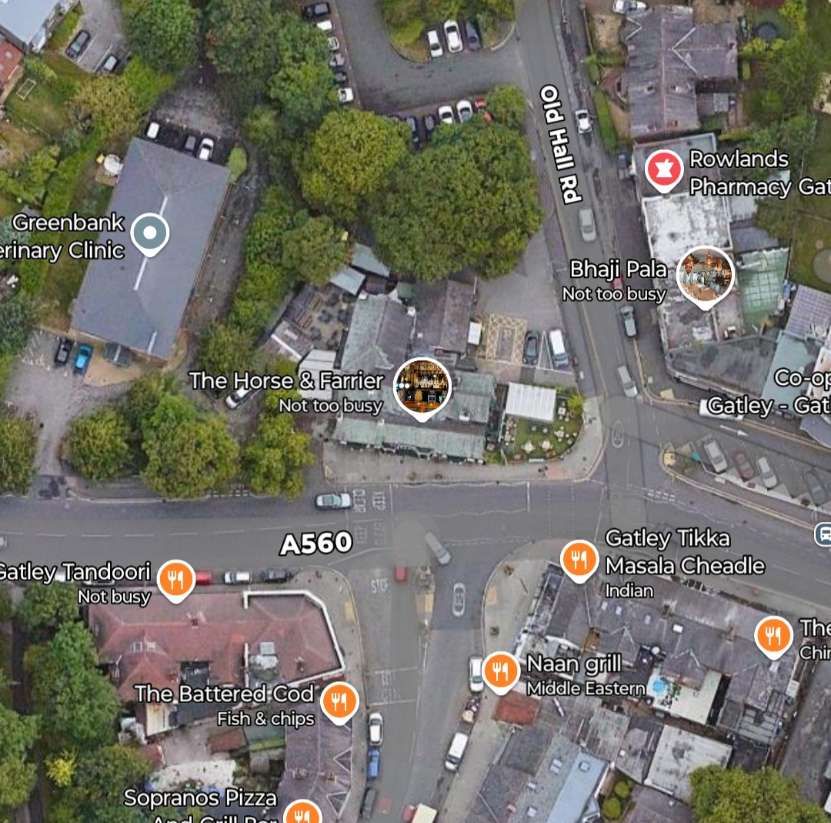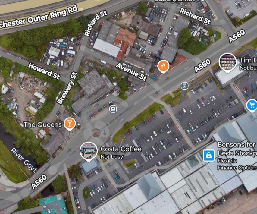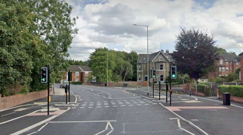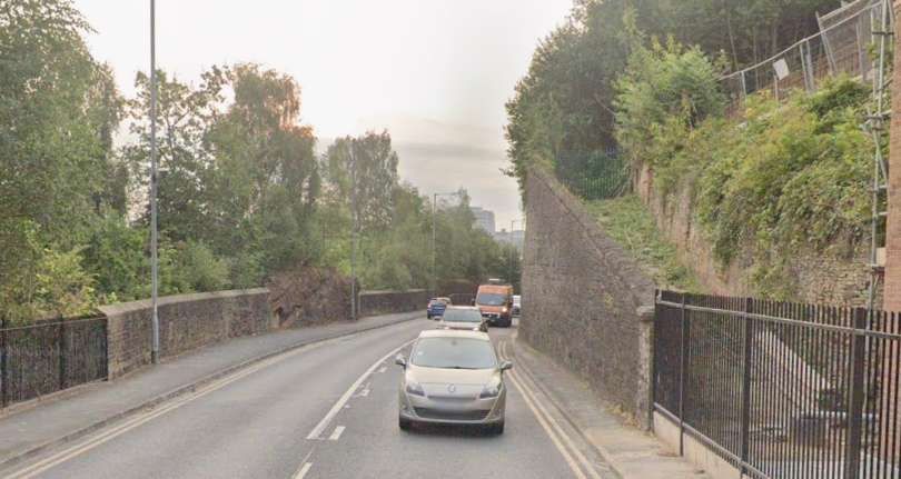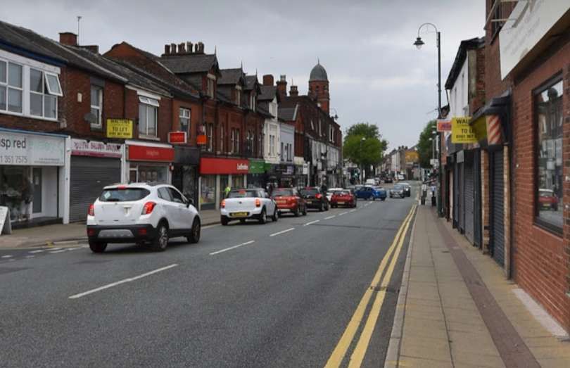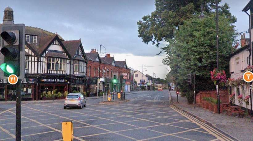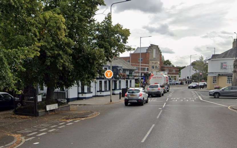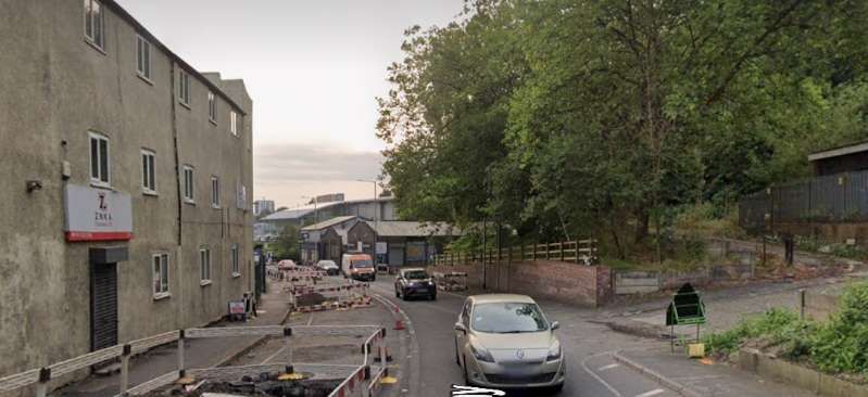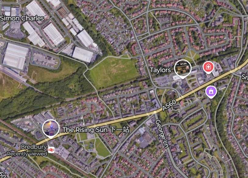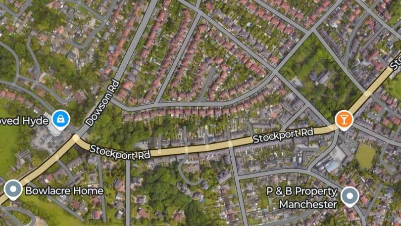 Looking South along the A483. There is nothing to see, at road level, of the bridge over the old railway. The line ran on the near side of the terrace visible on the right. [Google Streetview, July 2024]