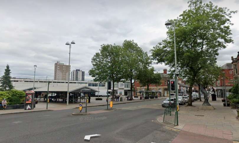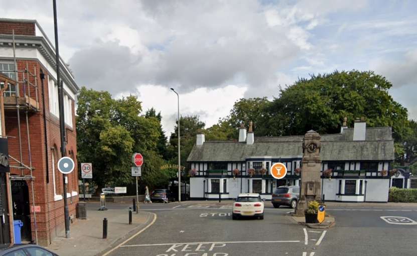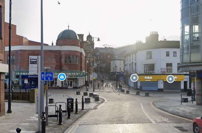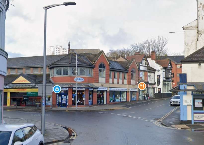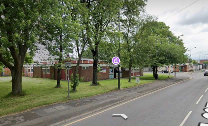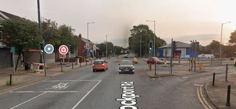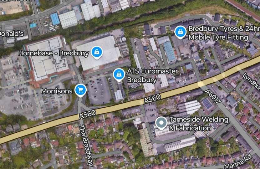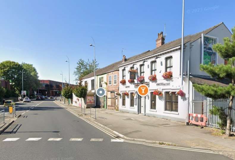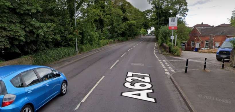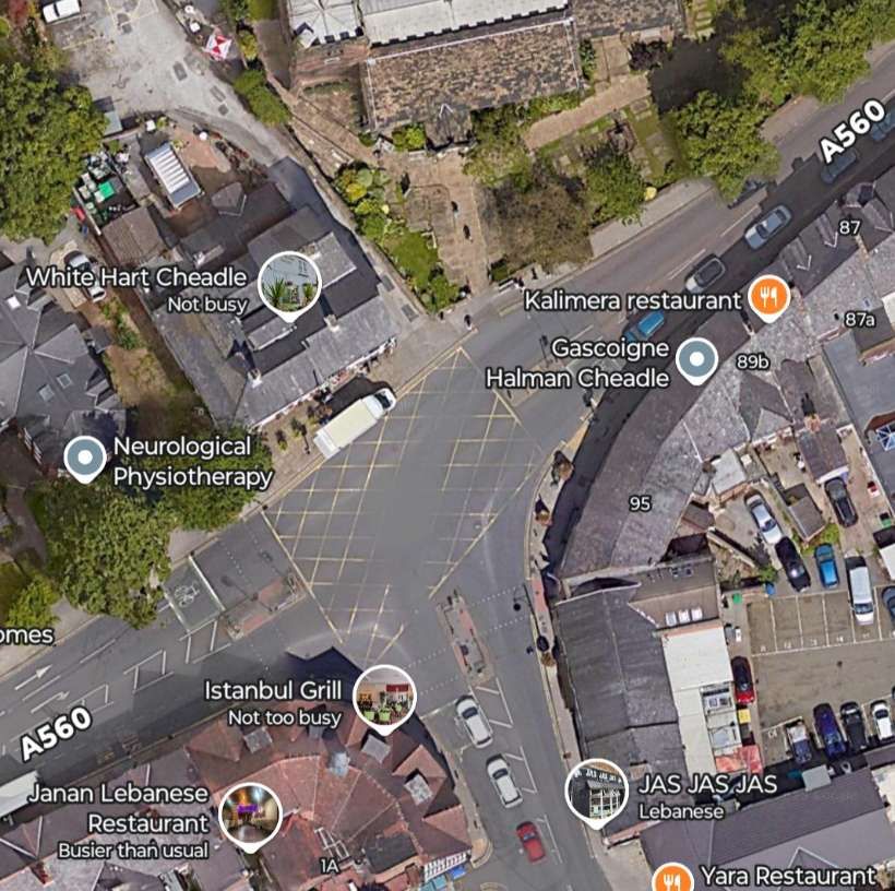 Looking South along the A483. There is nothing to see, at road level, of the bridge over the old railway. The line ran on the near side of the terrace visible on the right. [Google Streetview, July 2024]
