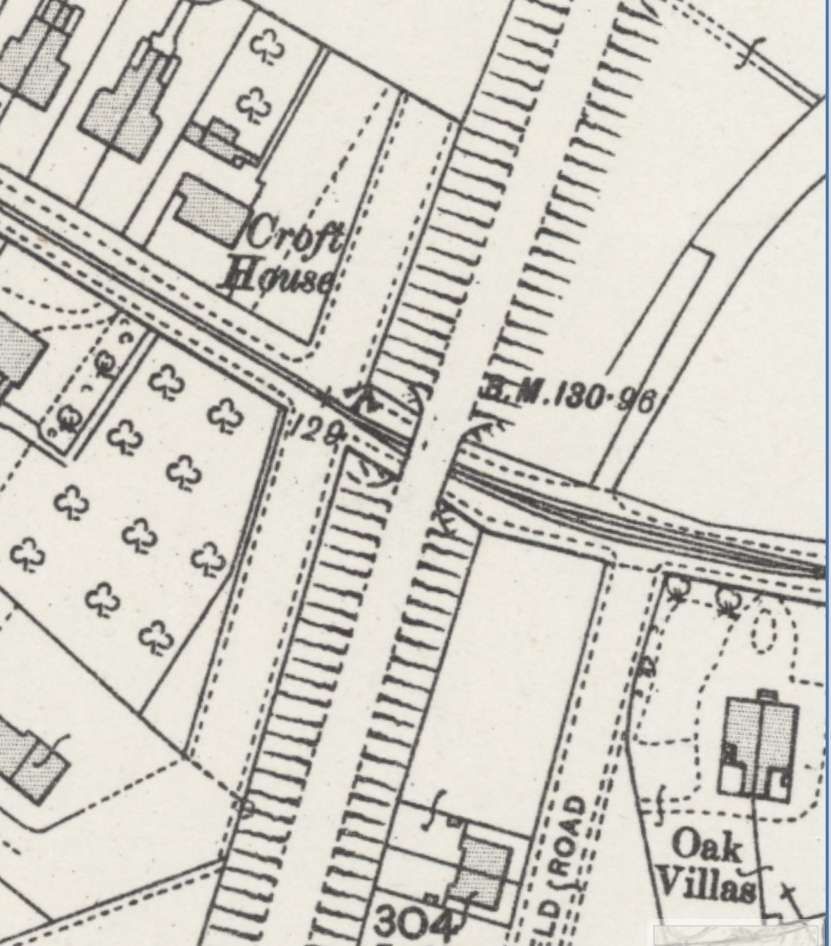 Looking South from Weston Road in the 21st century. [Google Streetview, April 2024]The line continues South-southwest [10]The modern day A483 crosses the line of the railway a little to the South of Weston Wharf. [Google Earth, February 2025]Looking North from the A483 in the first quarter of the 21st century. [Google Streetview, July 2024]Looking South from the A483 in the 21st century. [Google Streetview, July 2024]The line continued South-southwest. [10]And passed under one minor road and then over another (just at the bottom edge of this extract. [11]The first of the two bridges in the 21st century. [Google Earth, February 2025]Looking North from the minor road bridge in the 21st century. [Google Streetview, April 2024]Looking South from the same minor road bridge in the 21st century. [Google Streetview, April 2024]The second of the two bridges in the 21st century. [Google Earth, February 2025]Looking South through the bridge spanning Albridge Lane. [Google Streetview, April 2024]Looking North through the bridge spanning Albridge Lane. [Google Streetview, April 2024]Beyond Albridge Lane Bridge, the line continued Southwest passing under another minor road bridge which carried Church Lane and which can just be seen at the bottom of this extract from the 25″ Ordnance Survey of 1900. [11]Church Lane Bridge as it appears on satellite imagery in the 21st century. [Google Earth, February 2025]Looking North-northeast from Church Lane Bridge. [Google Streetview, April 2024]Looking South-southwest from Church Lane Bridge. [Google Streetview, April 2024]On this next extract, the minor bridge appears at the very top. South of that bridge the village of Llynclys was passed after the Tanat Valley branch left the main line heading West. [12]The same location as it appears on the ESRI [satellite imagery provided by the National Library of Scotland (NLS). [20]