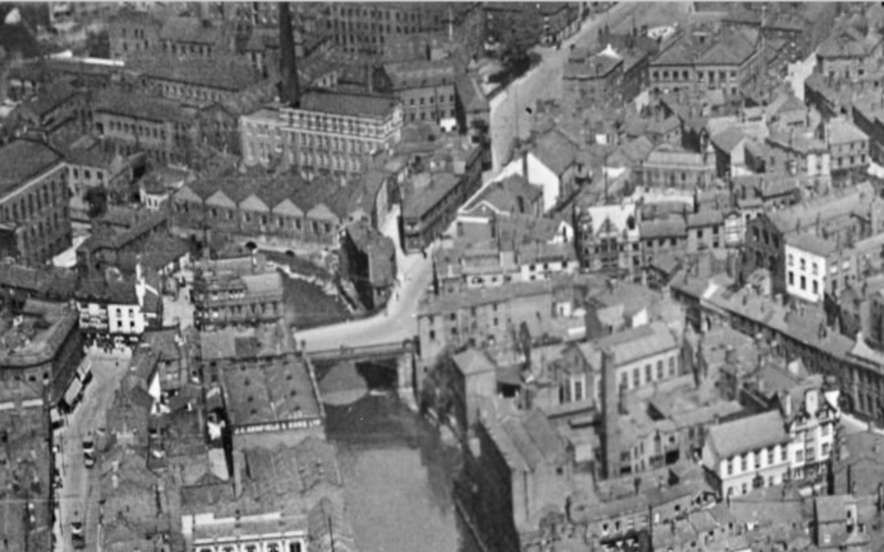 Oswestry Railway Station (at the top of this image) and the Cambrian’s Works (nearer the camera) seen in an aerial view looking from the Northeast across Oswestry (EAW056424, 1954). Historic England. [30]