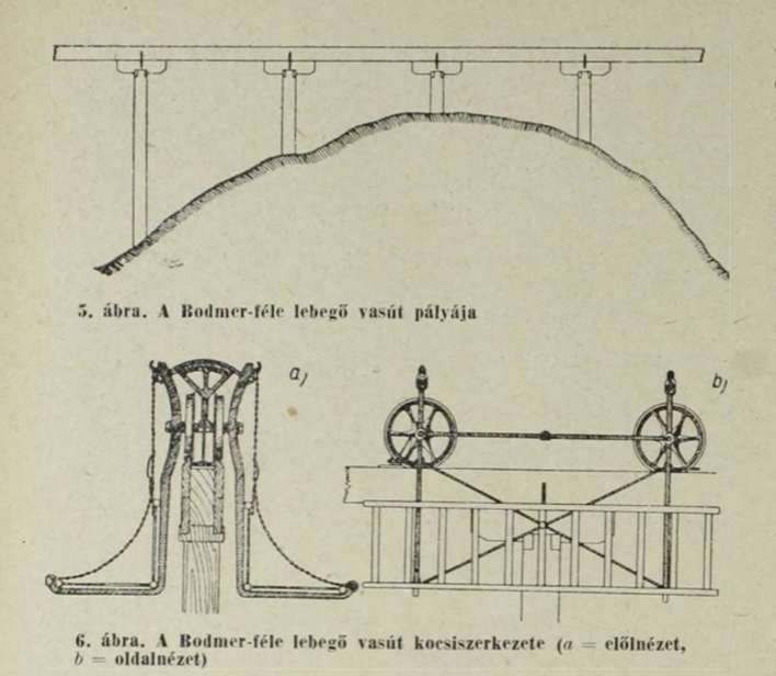 That railway “ran on a wooden structure running at an average height of one and a half to two metres above the ground, where the wooden beams were held by densely placed wooden posts. The wheels ran on very closely spaced rails on top of the beams, and the carriages hung down on either side of the entire structure, therefore floating, i.e. the design was very similar to a monorail.” [1]