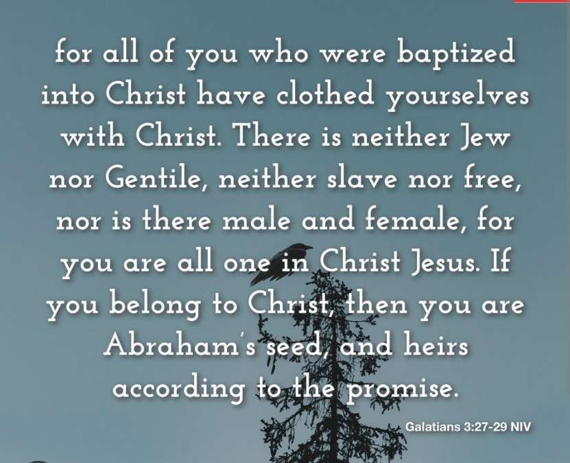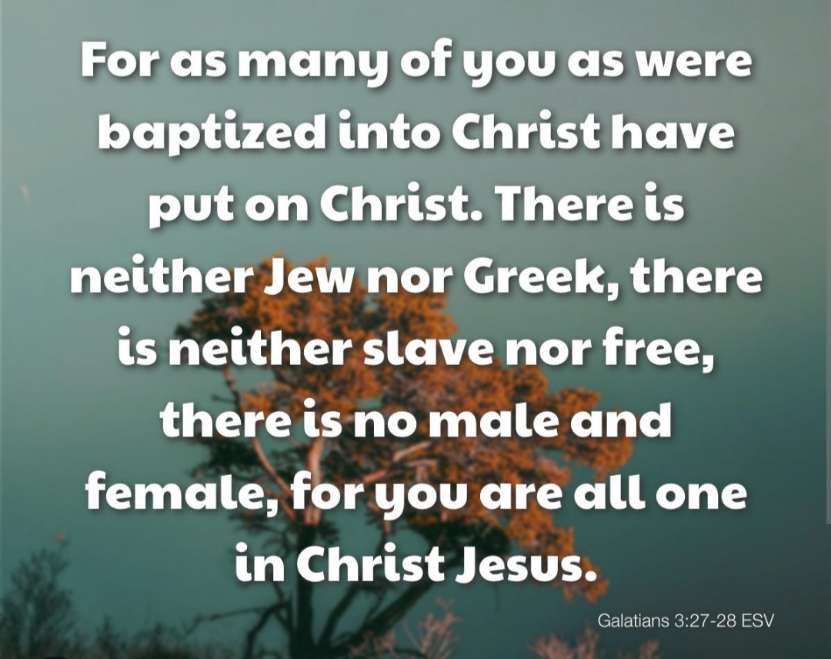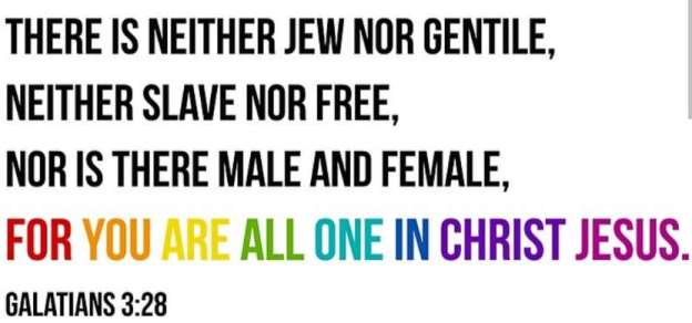 But is that difference significant? Perhaps it is sufficient for us to read that there is no distinction in Christ, that we are all one in Christ. Whether we are Jew or Greek, slave or free, male or female, there is no distinction between us. We are one in Christ, all of us ‘heirs’ of the promise, much more than just children. If that were the case, I would happily go on to argue that these pairings are intended to demonstrate the breadth of God’s inclusive love for everyone.
