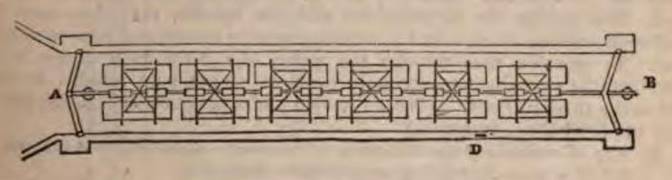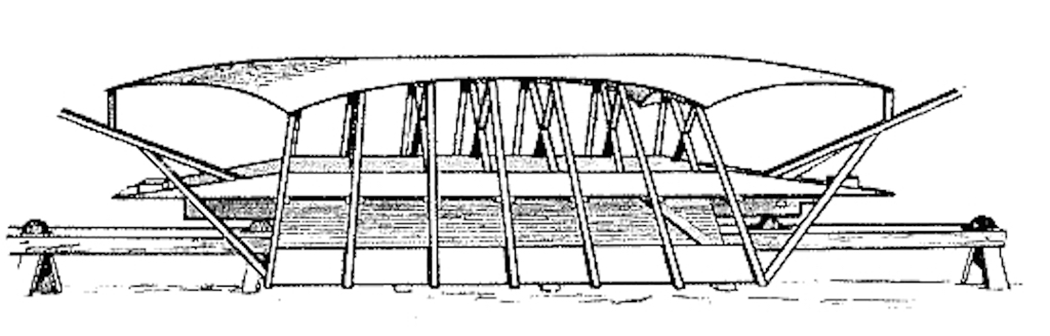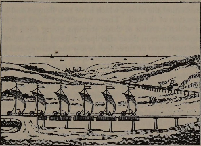 Palmer wrote in the study presenting his system: “the charge of carrying the raw material to the manufacturing district, and the manufactured article to the market, forming no small proportion of its price to the consumer.[…] The leading problem in our present subject is, to convey any given quantity of weight between two points at the least possible expense.[…] In order to retain a perfectly smooth and hard surface, unencumbered with extraneous obstacles to which the rails near the ground are exposed, it appeared desirable to elevate the surface from the reach of those obstacles and at the same time be released from the impediments occasioned by snows in the winter season.” [7]
