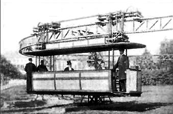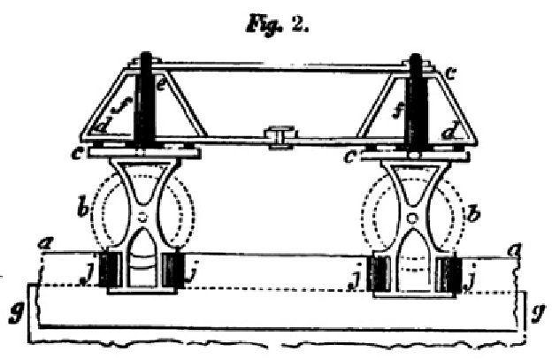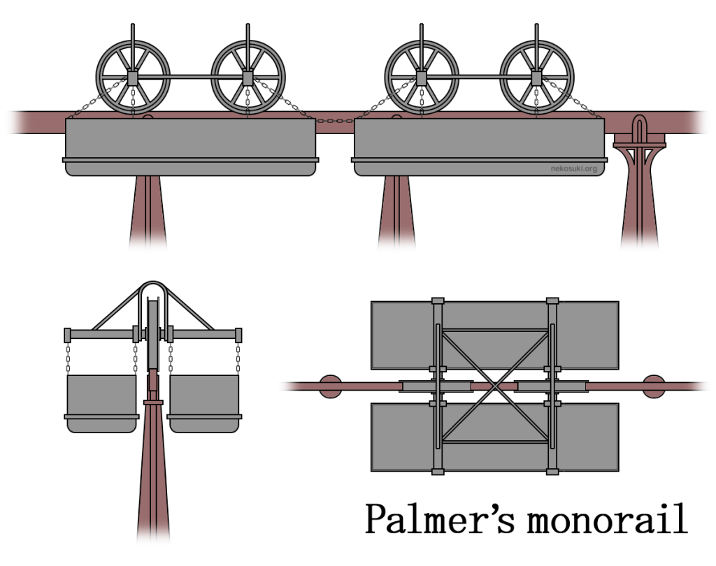 “Palmer made a patent application in 1821 for an elevated single rail supported on a series of pillars in an ordinary distance of ten feet, inserted into conical apertures in the ground, with carriages suspended on both sides, hanging on two wheels the one placed before the other. A horse is connected to the carriage with a towing rope, proceeding on one side of the rail on a towing path.” [4]