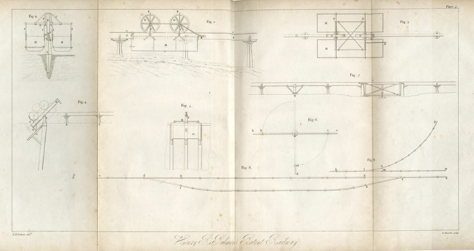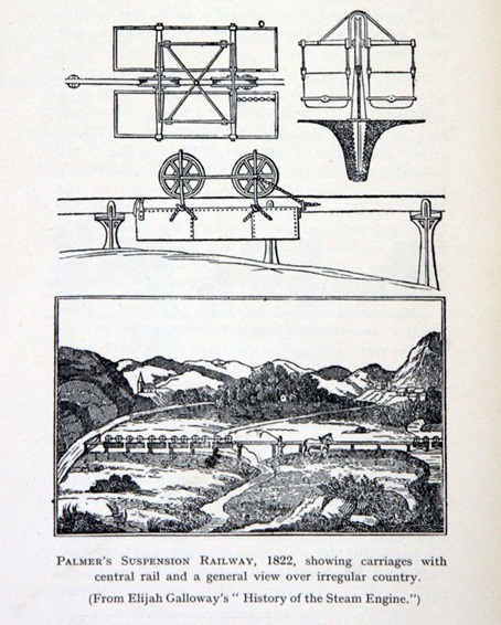 Elijah Golloway recorded Palmer’s ideas for a Suspension Railway in the image above which is dated 1822. It seems as though Galloway’s book, History of the Steam Engine, From Its First Invention to the Present Time: Illustrated by Numerous Engravings From Original Drawings, Made Expressly for This Work, was not published until 1828 by B. Steill. [4][5]