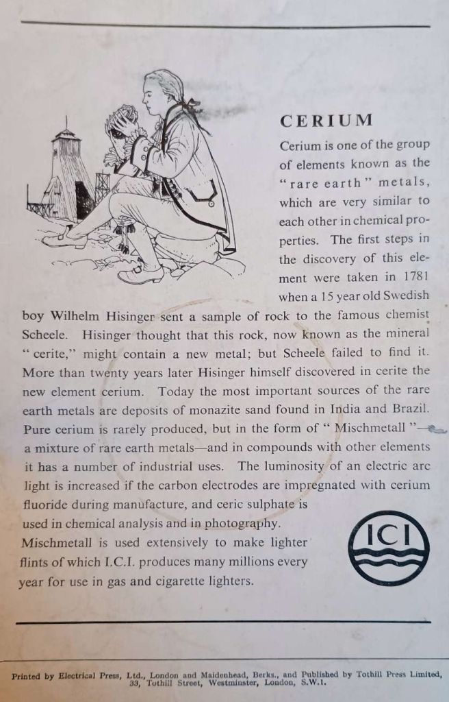 The final advert in the issue was on the back cover. It was placed by ICI advertising a particular ‘rare earth’ metal – Cerium. Rare-earth metals are of growing interest in the 21st century.
