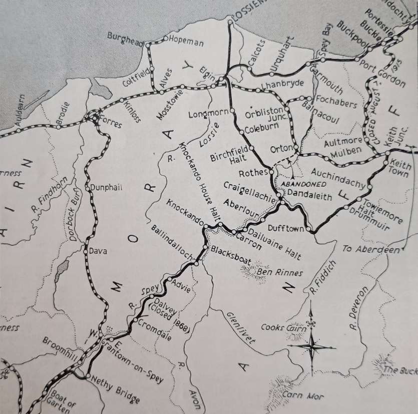 The Strathspey line also formed a junction at Craigellachie with the Morayshire Railway which gave a cess Loosiemouth via Elgin. The short connection between the Morayshire Railway and the Strathspey line was opened on 1st July 1863. Vallance notes that once the working agreement with the Great North came into force, “the Morayshire Railway virtually lost its separate identity. The Great North thus secured complete control of a route from Keith to Elgin, but many years were to elapse before through trains between Aberdeen and Inverness ran via Craigellachie.” [1: p5]
