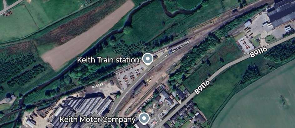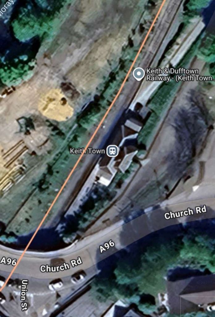 Keith Town Station seen from the A96 to the West – looking East. [Google Streetview, August 2025]