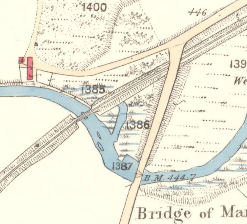 A short distance further Southwest the railway bridges the River Isla again. [20]