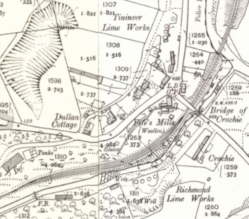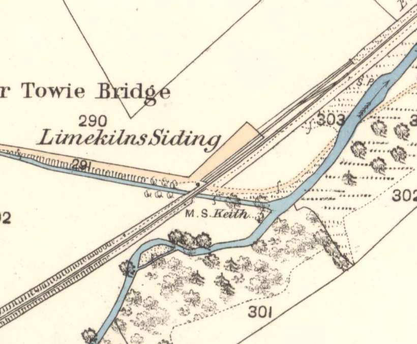 Just to the South East of Lower Towie Bridge was Limekilns Siding. This extract is from the 1st Edition 25″ Ordnance Survey of 1868 which was published in 1869. [20]