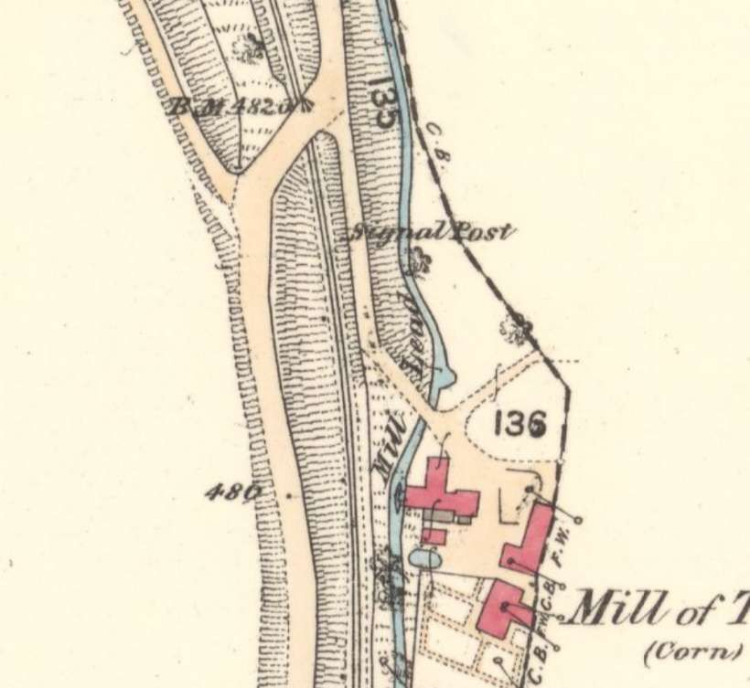 Immediately to the South of the station the railway passed the Mill of Towie. Here, the road crossed the line again. [15]