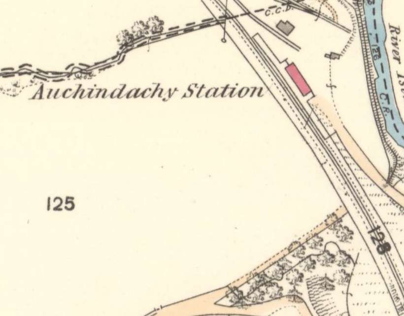 Auchindachy Railway Station had two platforms set on a gentle curve. Photographs of the station can be found here. [17]