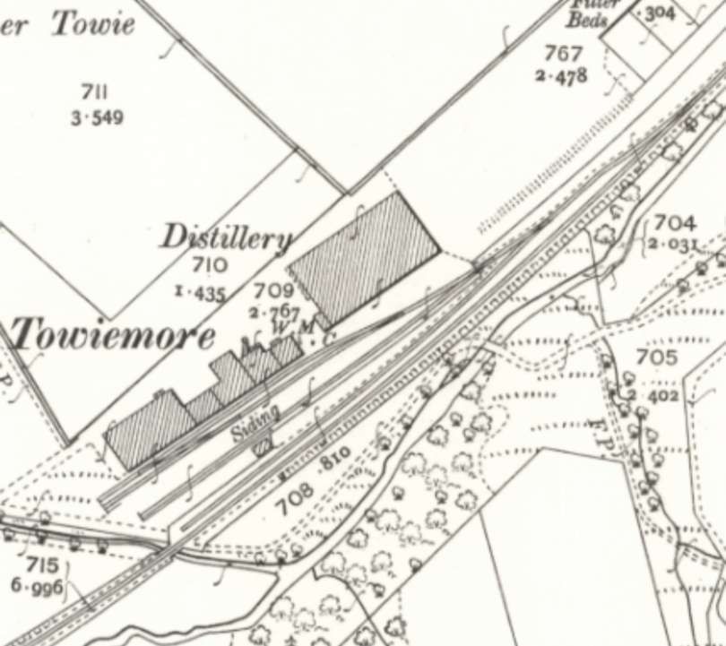 The same location as it appears on the 2nd Edition 25″Ordnance Survey of 1903, published in 1904. The site is in use as Towiemore distillery. [21]