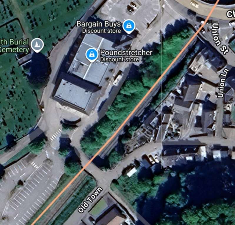 The same location in the 21st century. The railway can just be made out but the route of the road is less easy to pick out so its centre-line is highlighted by the blue line. [Google Maps, January 2026]