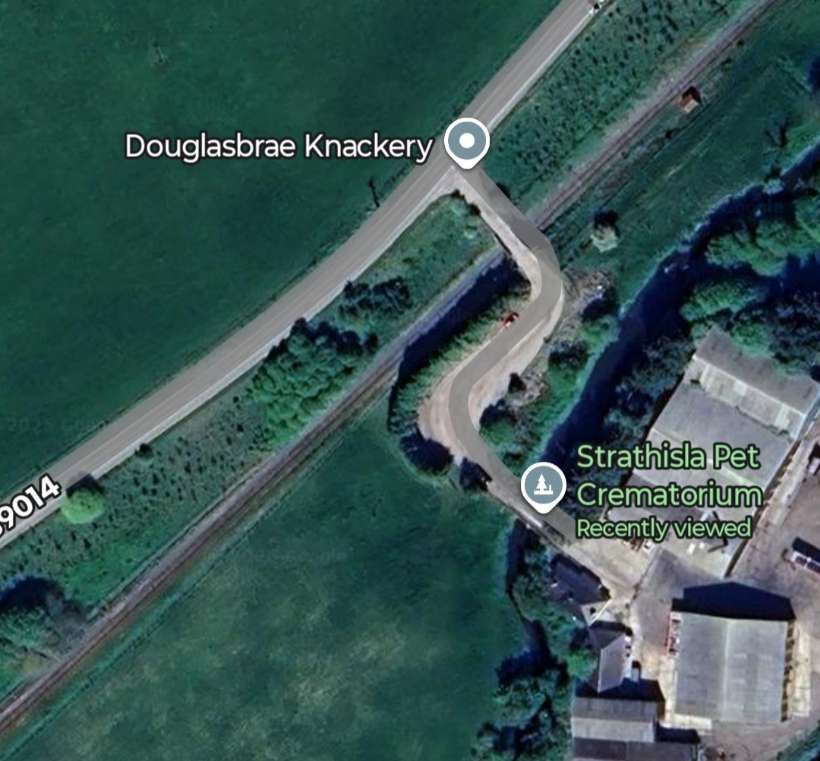 The same location in the 21st century. I am not quite sure what I think about the two different names given to the site of what we’re on e the Douglasbrae Lime Kilns – Strathisla Pet Crematorium sounds so much better than Douglasbrae Knackery! [Google Maps, January 2026]