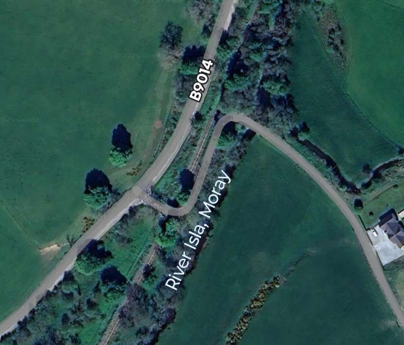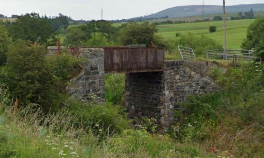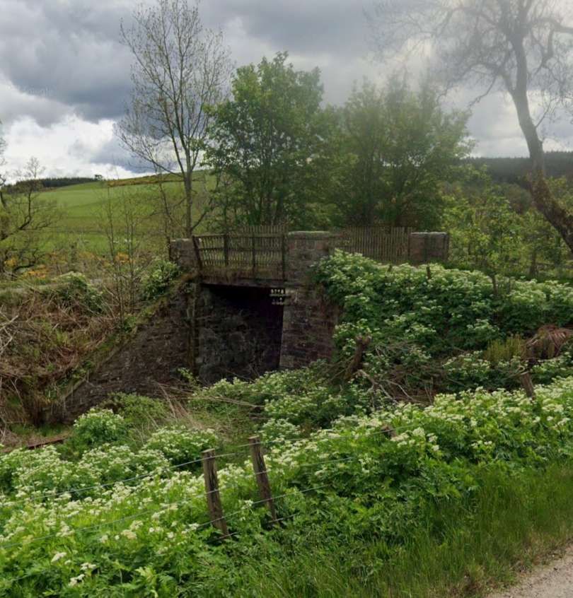 The railway bridge over the Isla is hidden by vegetation from the B9014. This is the view from the North on the minor road mentioned above. [Google Streetview, March 2022]