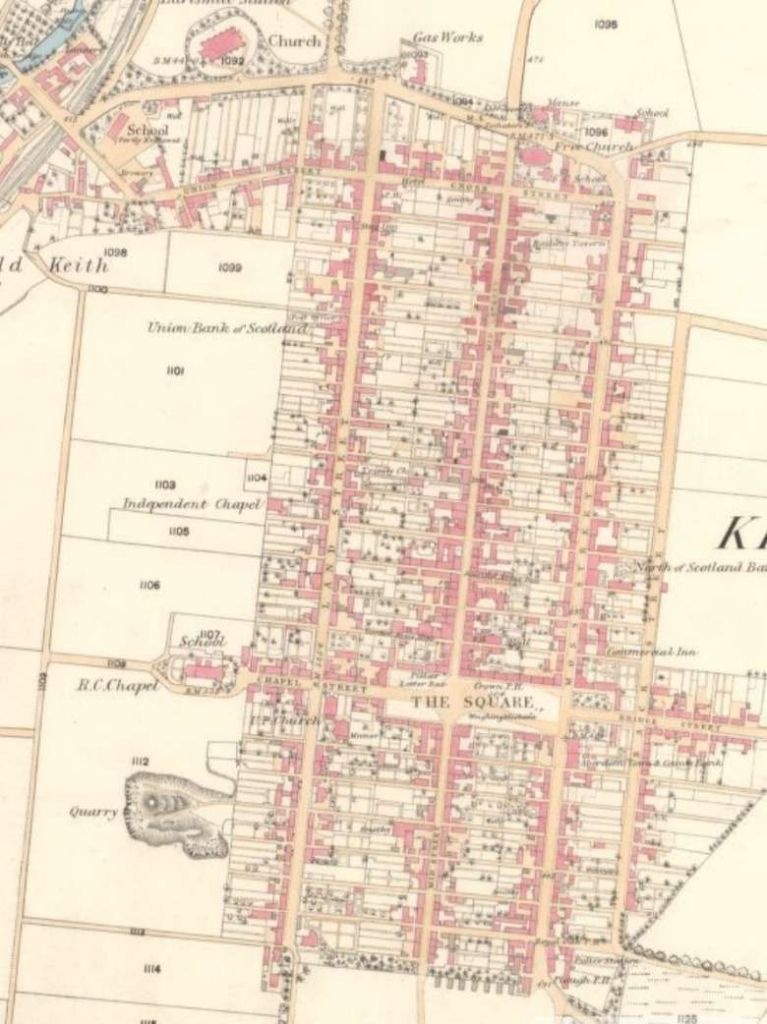 Keith Town: the railway station is visible to the top left of this map extract which shows the town as laid out by the Earl of Findlater in 1750. [11][14]