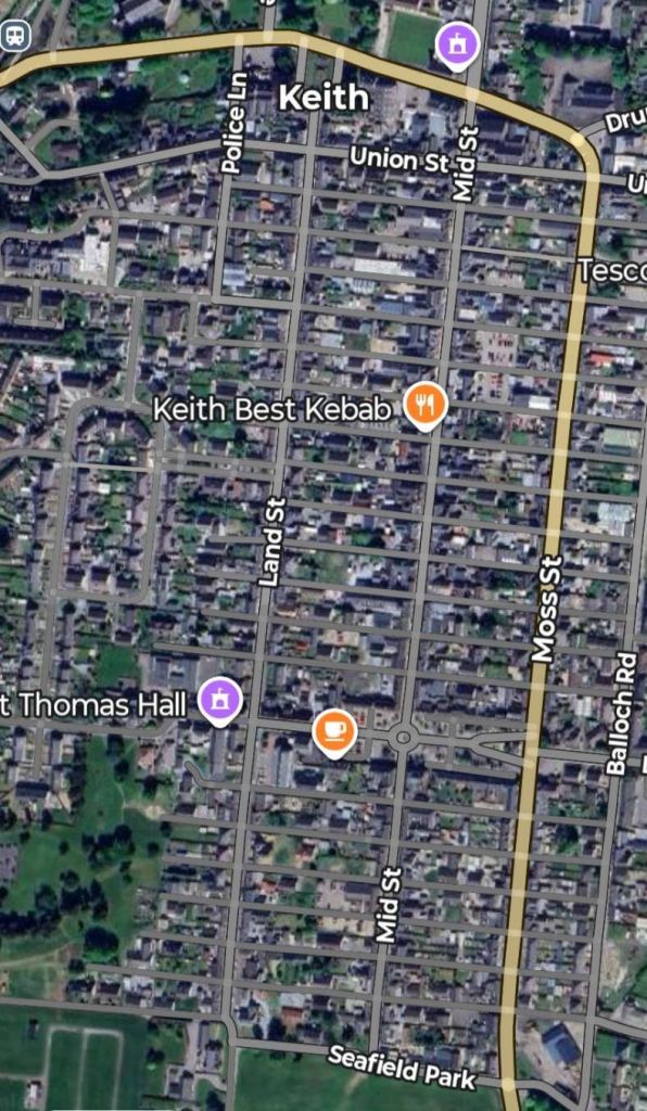 The same area of Keith as shown on the map extract above, as it appears in the 21st century. The railway station is just visible to the top left of this satellite image. [Google Maps, January 2026]