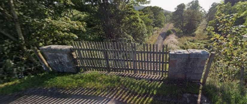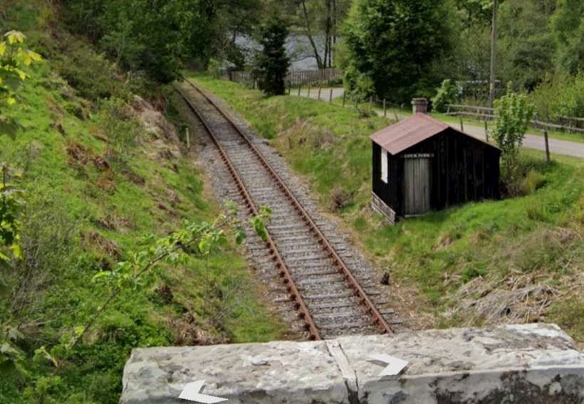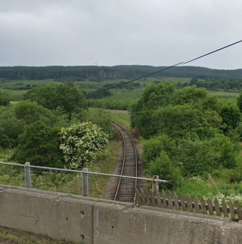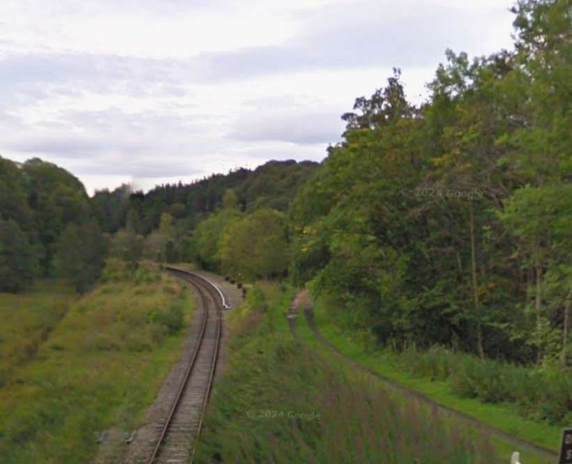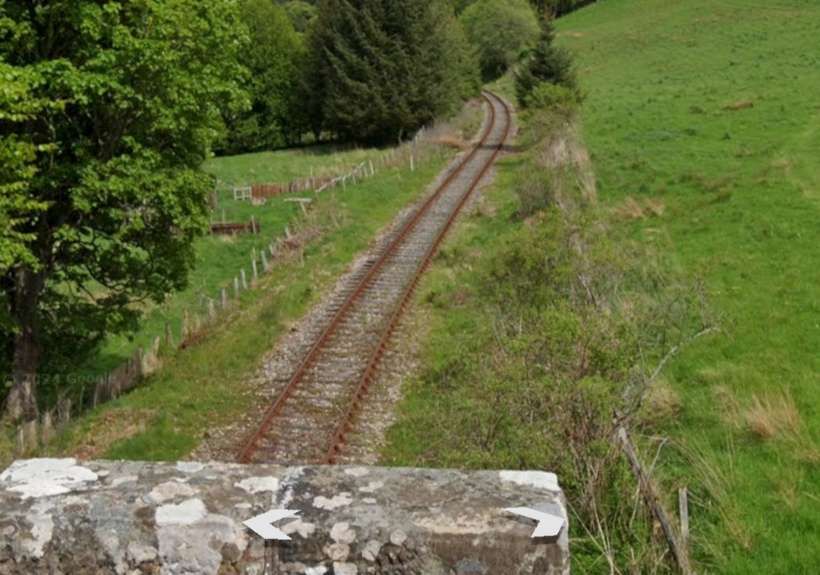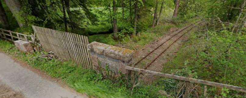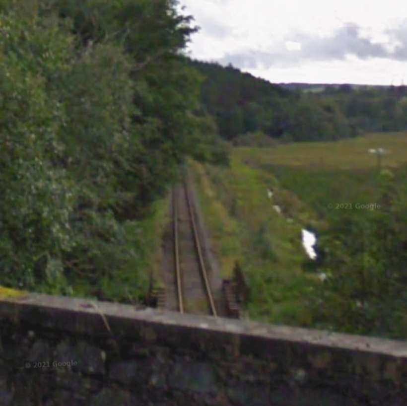Looking West along the line from the bridge towards Loch Park. Note the well-kept permanent way but between the railway and the road. [Google Streetview, May 2022]