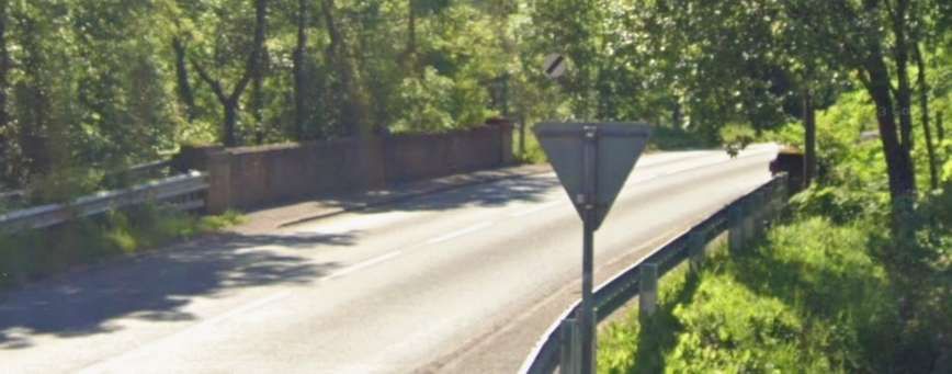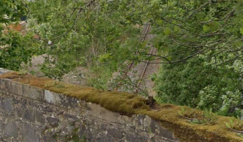 The realigned road overbridge as it appears in the 21st century. The railway can be seen, but the bridge also spans the River which is shrouded in vegetation. [Google Maps, January 2026]