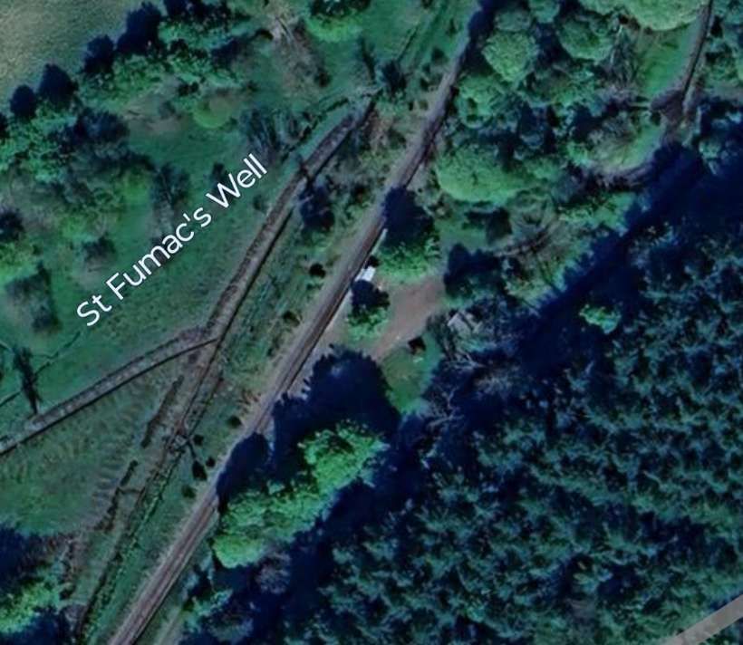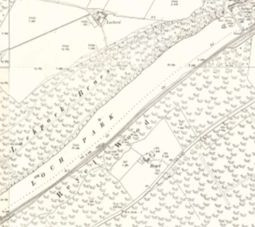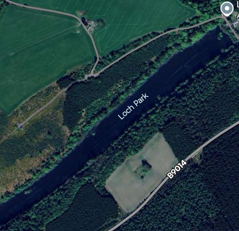 This modern satellite image shows the railway running alongside Loch Park. Its route appears as a dark line in the trees immediately adjacent to the Southeast shore of the Loch. [Google Maps, January 2026]