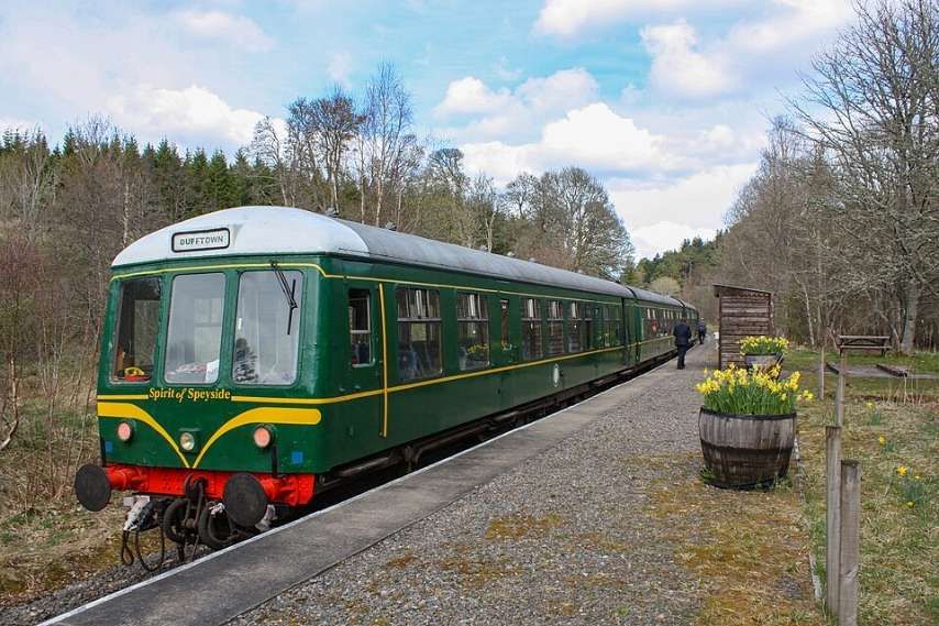 Keith Town Railway Station seen from the Northeast in August 2025. The Keith Town Railway Station serves the Keith–Dufftown heritage railway line, also known as “The Whisky Line”. The photograph shows one of the line’s two trains, known as the “Spirit of Banffshire”, © Lucas Kendall and licenced for reuse under a Creative Commons licence (CC BY-SA 2.0). [10]