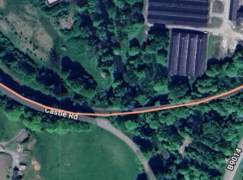The view looking East from Castle Road (B975) towards the bridge over the River Fiddich. [Google Streetview, September 2025]