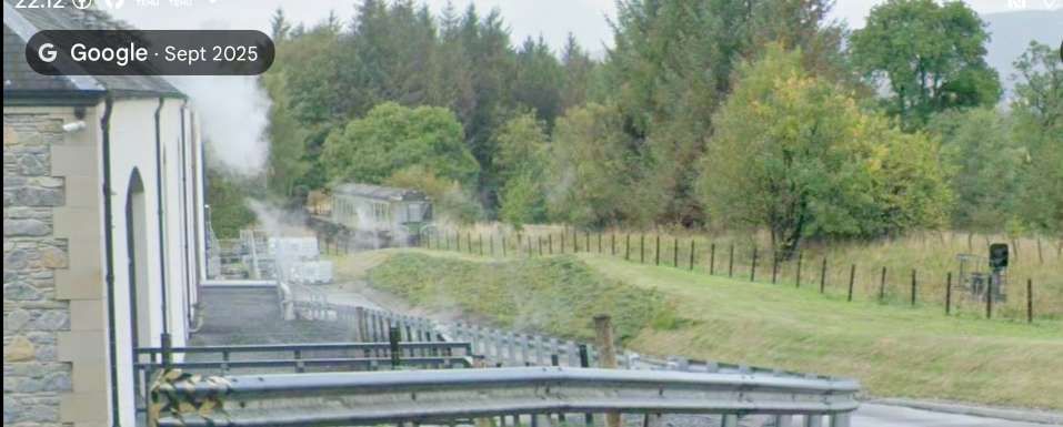 Looking North alongside Glenfiddich Distillery from Castle Road (B975), the line can be seen in a shallow cutting on its approach to Dufftown Railway Station. A DMU can be made out in the middle left of the photograph. [Google Streetview, September 2025]