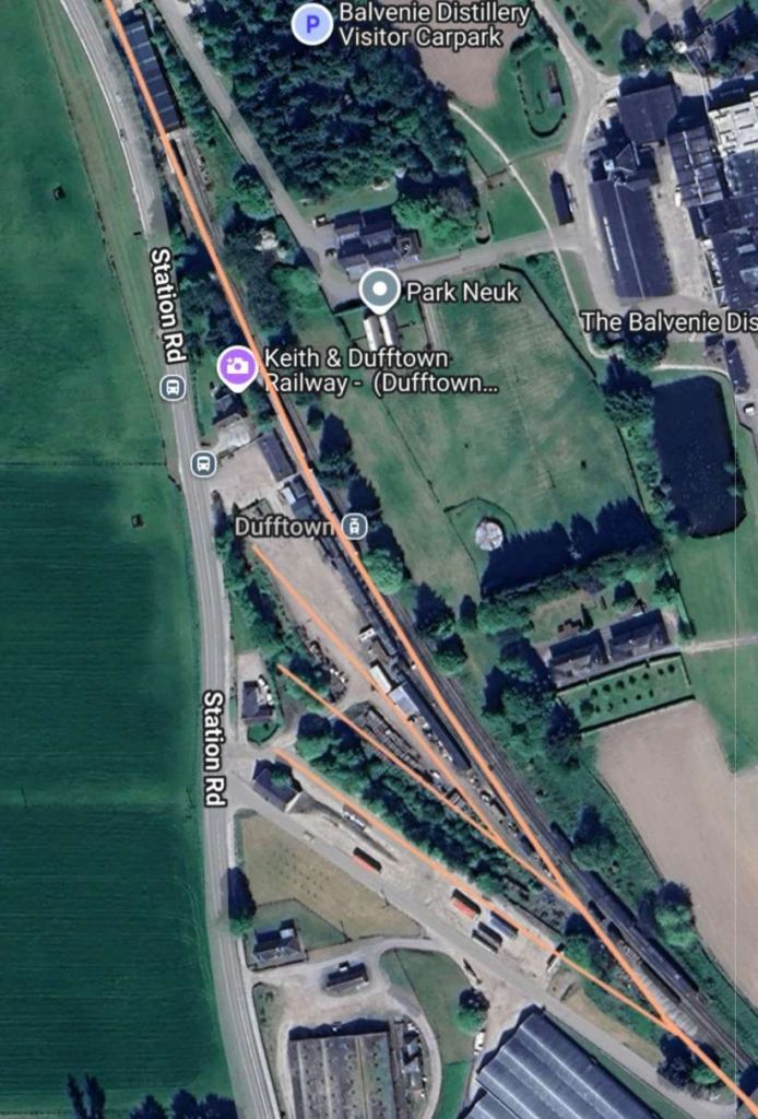 The Glenfiddich Distillery in the 21st century with the original railways shown as orange lines superimposed on the satellite imagery from railmaponline.com. [9]