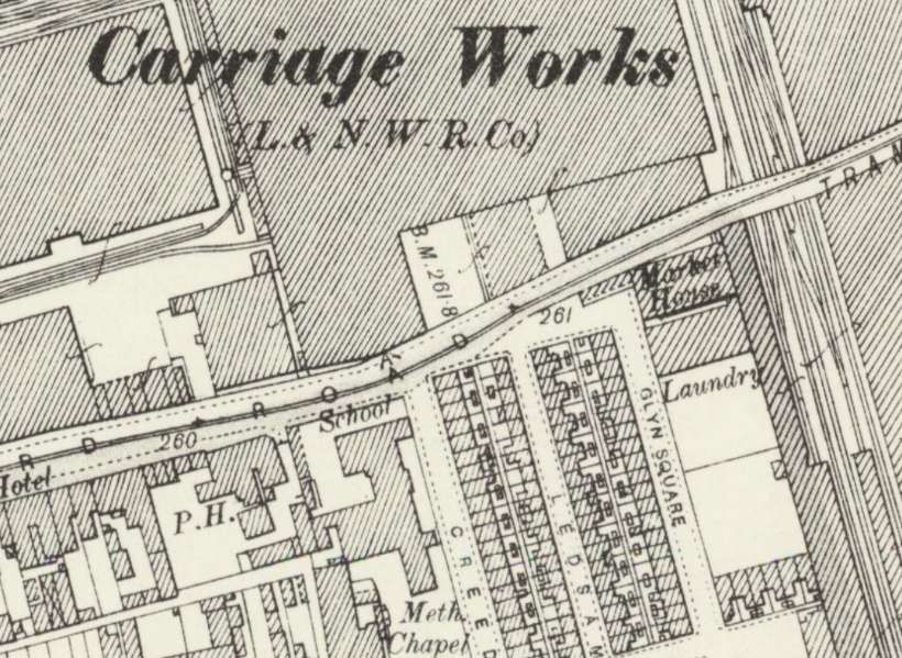 To avoid passing through the Wolverton Carriage Works, a railway main line deviation to the east was opened in August, 1881. The present Wolverton Station was built on the new line.
