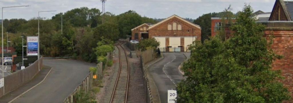 Allan Edwards describes the route of the tramway through Wolverton like this: Outside Wolverton Station goods yard there was a turning triangle on a steeply descending section of road and a link into the station goods yard. From this location, trams “climbed steeply on a right-hand curve to the road bridge over the 4-track railway line where tramway passengers could board outside the overline buildings of the LNWR station. The tramway then continued up and over the lines leading into the railway works. … With its track in the centre of the highway the tramway passed the railway workshops, the town of Wolverton being entirely on the left-hand side. Virtually continuous brick walls to the right sealed off first the LNWR works and then McCorquodale’s printing factory. It was nearly three quarters of a mile before the tramway line abruptly left the town behind, moving to the lefthand side of the road.” [13: p17]