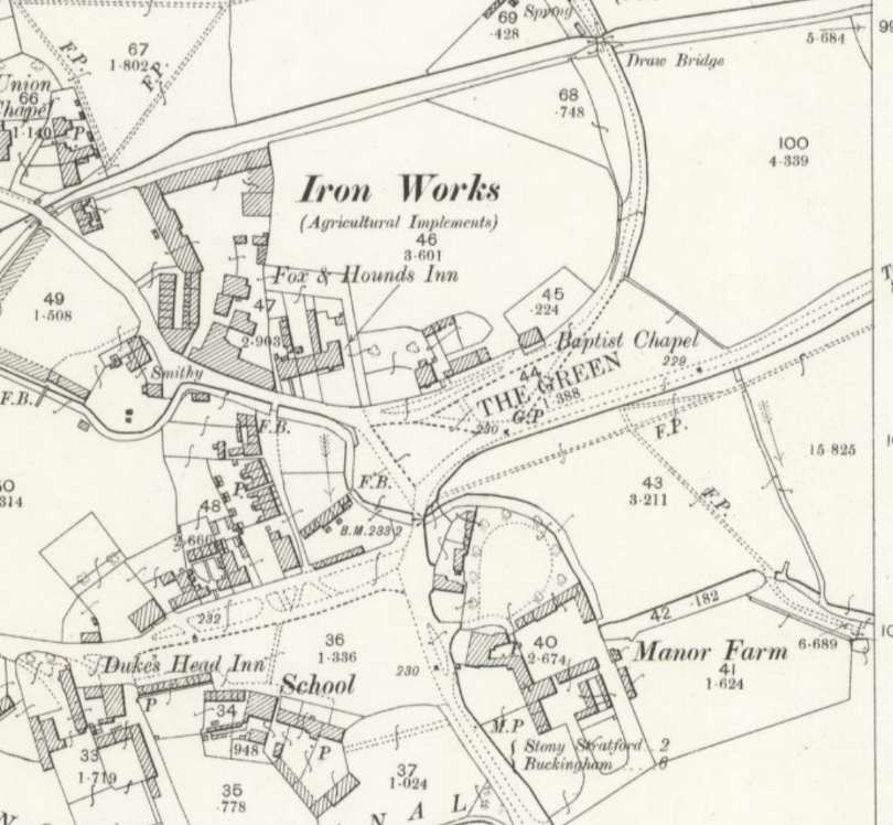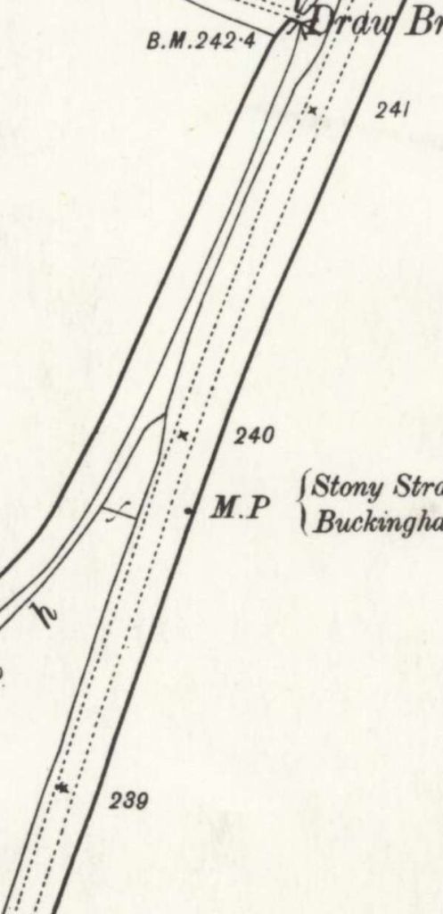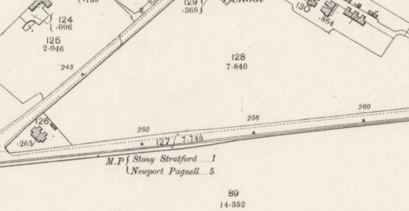 This next smaller map extract brings the line to the edge of the Ordnance Survey map sheet and shows the beginning of the housing at the eastern edge of Stony Stratford. [12]