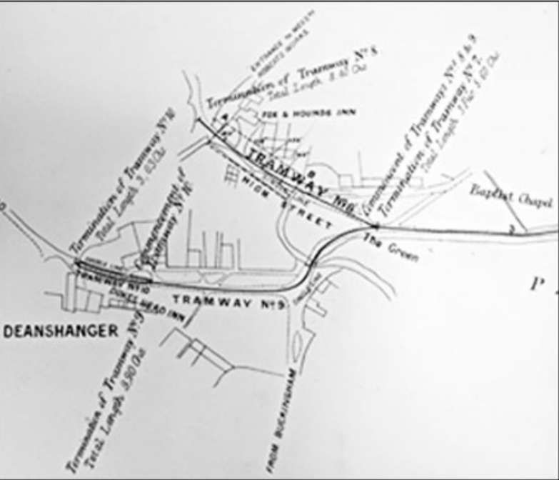 Allan Edwards tells us that, “Leaving The Barley Mow and taking its normal position in the middle of the road the extension travelled straight for almost three quarters of a mile over the embankment that carried the highway across the floodplain of the River Ouse. The river was the county border. Climbing very steeply into the Northamptonshire village of Old Stratford, the line then swung sharp left onto the Buckingham road. A separate depot and workshop for this section of line was established at this corner. … The line then ran parallel to the Buckingham arm of the Grand Junction canal to Deanshanger where it terminated on the village green outside The Fox & Hounds public house. This extension was sanctioned by the Board of Trade on 24th May 1888 and immediately came into public use.” [13: p18]