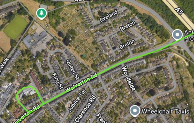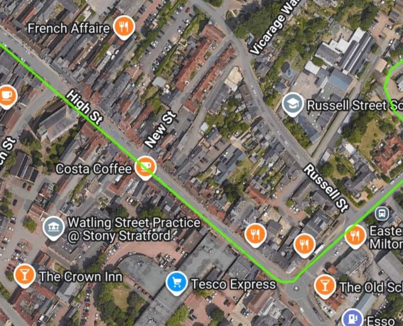The view Northeast along Wolverton Road in Stony Stratford. The depot is behind the housing in the middle distance. To the left of the camera the tramway ran away to the Northwest. The Forresters Arms is on the left side of the photograph. This image was shared on the Stony Stratford Photos Facebook Group by Edward Corney on 20th November 2018. [22]