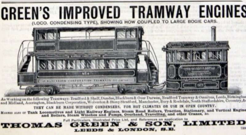 Thirty-nine Wilkinson type trams were delivered before Green’s developed their own design using a horizontal boiler, inclined cylinders and Joy valve gear. These tram engines first appeared in August 1885. The machine quickly evolved such that Green’s tram engines became one of the market leaders. [26][27] It was Green’s own design of tram engine that was supplied to the Wolverton & Stony Stratford Tramway.